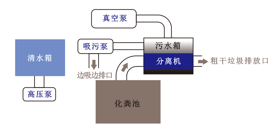 | 时间 | 按一台吸污车把污水倒到郊外来回一次50分钟计算,加上抽排需要20分钟,如果一天往返5次则需要350分钟 | 每一次抽+甩干分离+排需要10分钟,5次的话需要50分钟,免去了运输时间,也就是50分钟就完成了传统吸污车350分钟的工作量 |