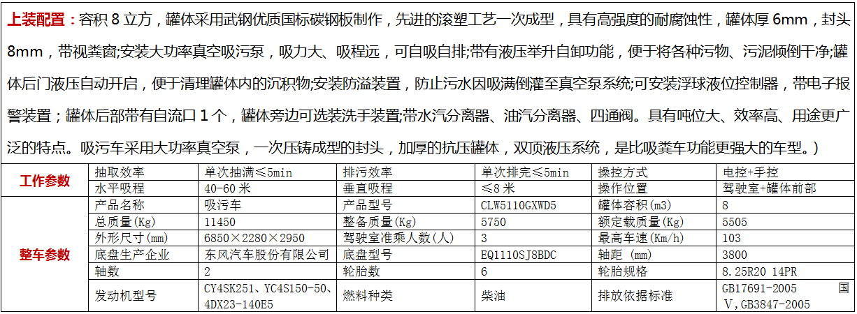| 选装配置 | 液满报警自停、水环式真空泵、罐内防腐处理、固液分离过滤筒+液压绞龙、本田洒水泵+洒水炮 | ||