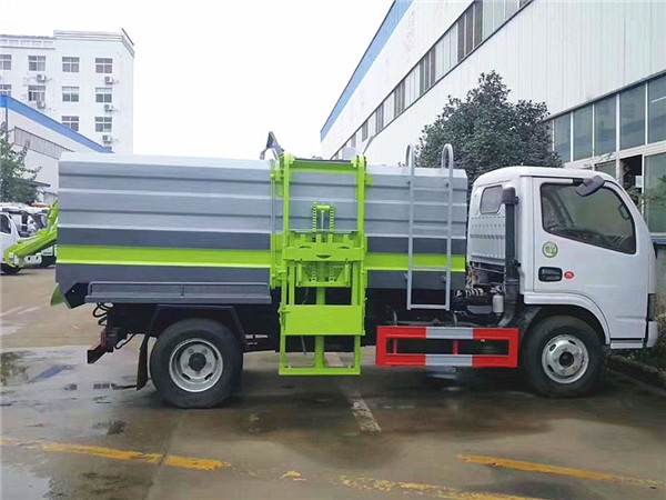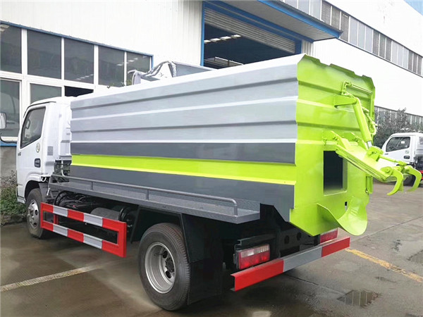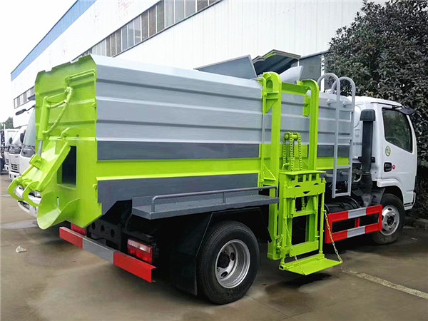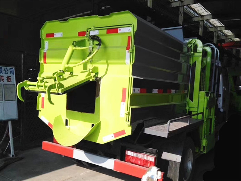 上装配置:方形箱体有效容积5立方,箱底双液压缸举升自卸,车侧配链条提桶机构,尾部小门液压打开锁紧。