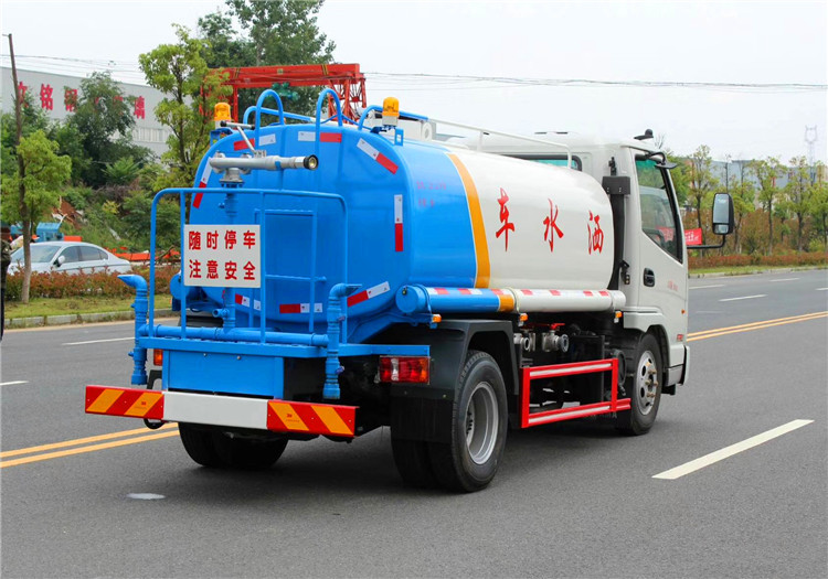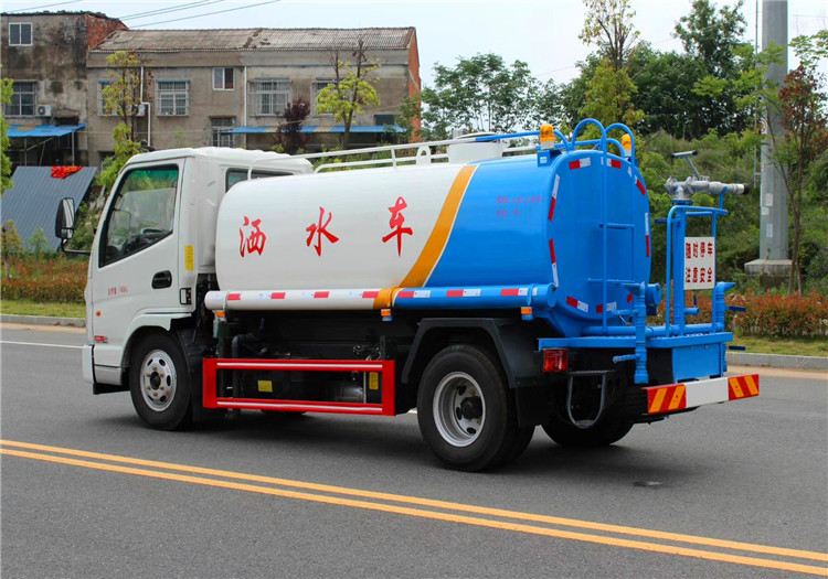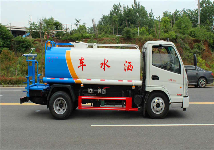 上装配置:罐体容积为5立方洒水车,新款工艺罐体,厚度为4mm碳钢Q235材质,罐内隔板具有防波作用,以减轻汽车行驶时罐体液体冲击,罐体及整车外形尺寸按照公告。带大功率专用洒水泵,泵可自吸自排,整车前冲、后洒、侧喷、带65消防接口,后平台带绿化洒水炮,洒水炮可全方位旋转,可连续调成直冲状、大雨、小雨、毛毛雨;前封头带水位计,后平台主管路带1寸浇花接口,后爬梯。平台后部带小安全告知牌:“随时停车,注意安全”,带两根水管及阴阳端。罐体颜色:上白/下蓝,银灰/银蓝,罐体两侧喷“洒水车、绿化洒水车”字样,贴反光标示。洒水车可加装前冲后洒气动阀驾驶室控制、可加装雾炮机组发电机组喷雾降尘装置、车头可加装推雪雪铲、雪滚装置街道、公路除雪等。