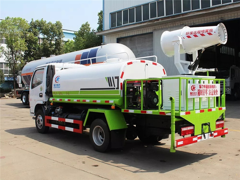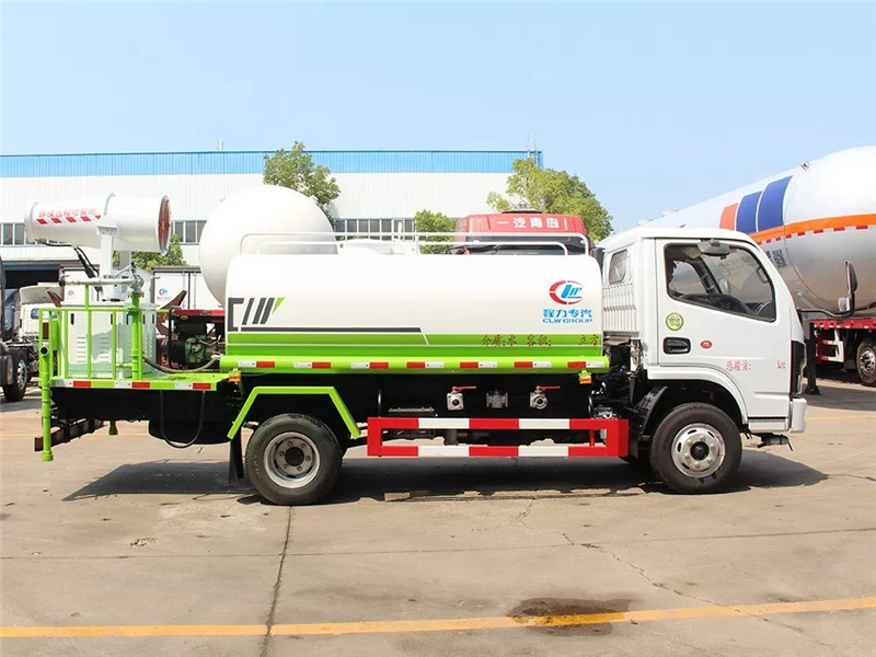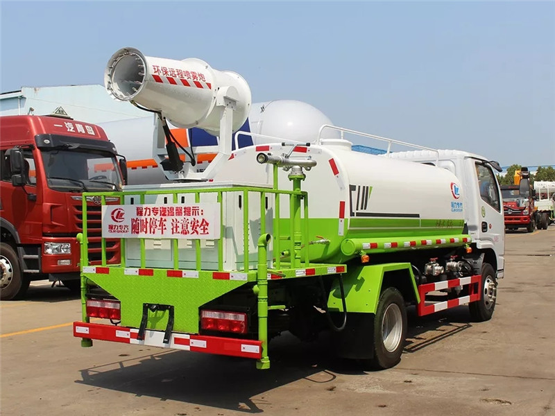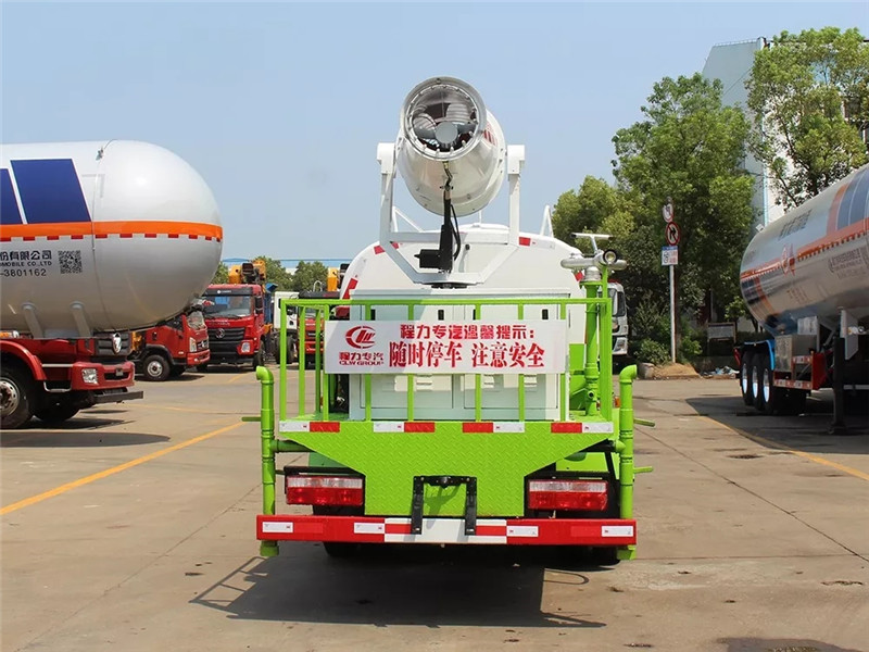上装配置罐体有效容积5方,罐体材料使用正宗国标5mm厚的优质碳钢板,罐体内部做防腐防锈处理使用寿命长,配大功率洒水泵(可实现泵进泵出功能)。标配:前冲、后洒,侧喷,自流阀和消防接头各1个,平台高炮(绿化水炮射程28米远,可全方位旋转,可连续调成直冲状、大雨、小雨、毛毛雨,雾状)。平台后部带小安全告知牌:“随时停车,注意安全”,带两根水管及阴阳端,后工作平台加装高效率车载式风送喷雾机组,(根据客户要求制定)雾化效果好,可远程喷雾。