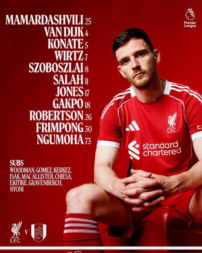 利物浦vs富勒姆:维尔茨、萨拉赫首发,恩古莫哈、罗伯逊出战